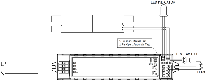 4) Emergency Simulation: Switch on, the load lamp turns on, press the switch(TEST SWITCH), then switch to emergency mode, the indicator light of the emergency driver will be extinguished. Release the switch(TEST SWITCH), then the lamp is powered by the LED driver, the indicator light will turn on.